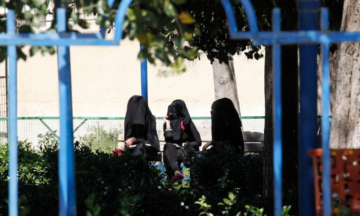 | Veiled women sit on a bench in Raqqa. Isis has imposed sweeping restrictions on personal freedoms, and women must wear the niqab, or full face veil, in public or face punishment. Photograph: Reuters |