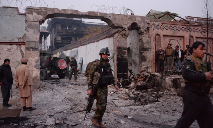 | Afghan security forces inspect the site of the attack on Save the Children’s office in Jalalabad on Wednesday. Photograph: Noorullah Shirzada/AFP/Getty Images |