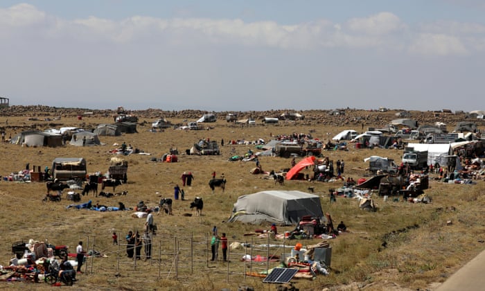 | Internally displaced people from Deraa province are gathered near the Israeli-occupied Golan Heights in Quneitra, Syria. Photograph: Alaa Al-Faqir/Reuters |