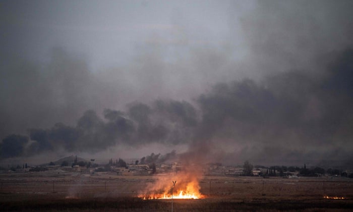 | Smoke rises from the Syrian border town of Tel Abyad, following an offensive by pro-Turkish forces. Photograph: Bülent Kılıç/AFP via Getty Images |