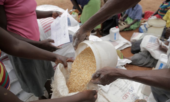 | A woman pours food aid into a sack at a distribution point for Mafomoti primary school in Zimbabwe’s Mwenezi district. Photograph: Aaron Ufumeli/EPA |